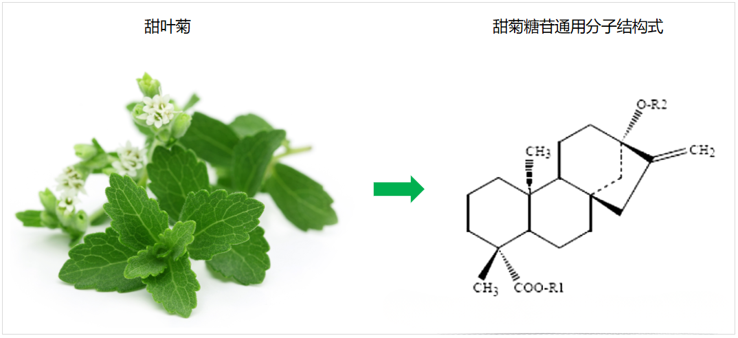 甜菊糖苷源自天然植物甜叶菊。这种原产于南美洲巴拉圭的多年生草本植物,其叶片中含有自然界已知甜度高的天然甜味成分之一。甜菊糖苷并不是单一成分,而是一个庞大的糖苷家族,目前已发现的就有超过70种不同的甜菊糖苷。其中主要的是甜菊苷(Stevioside)和莱鲍迪苷A(Reb A),它们占总量的80%以上。