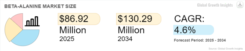 市场规模与增长:全球β-丙氨酸市场正稳步扩张。数据显示,2025年市场规模预计约8692万美元,到2034年有望增长至约1.3029亿美元,年复合增长率约4.6%。